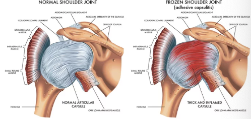 - 오십견(Frozen Shoulder): 의학적으로는 유착성 관절낭염이라 불리며, 어깨 관절을 감싸는 조직이 염증과 유착으로 인해 경직되고 통증이 생기는 상태.