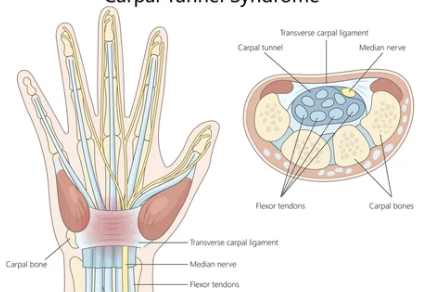 손목 터널 증후군은 손목의 신경(정중신경)이 압박되어 발생하는 신경병증이다.